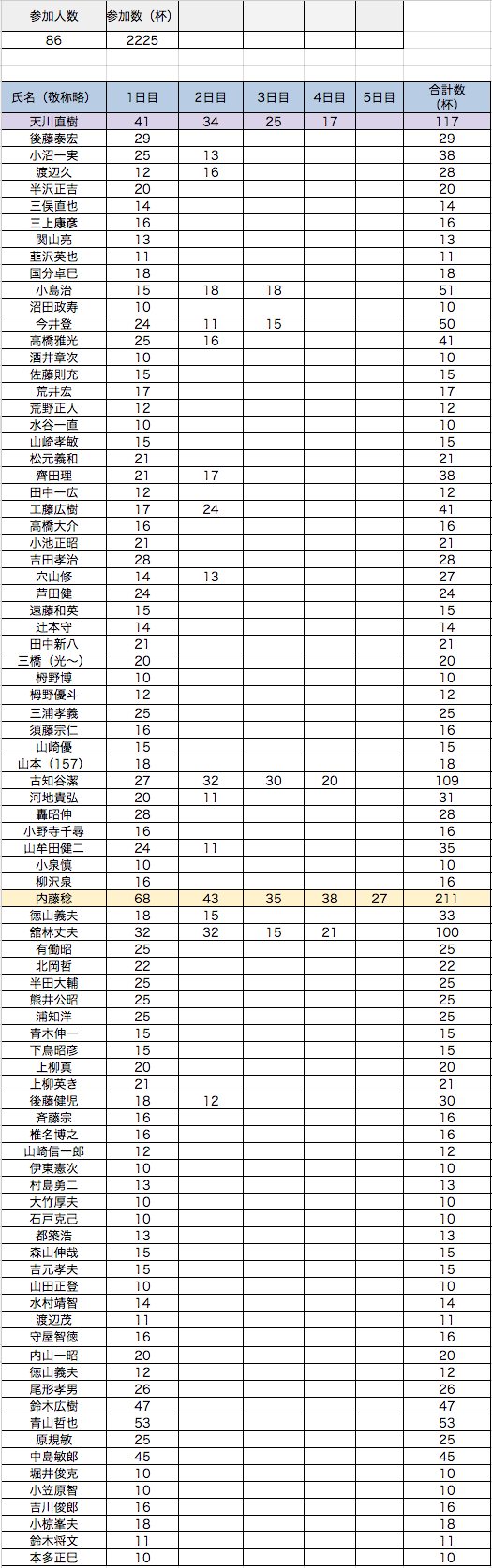初代数釣王は、最後の最後まで粘った、内藤稔様。211杯!