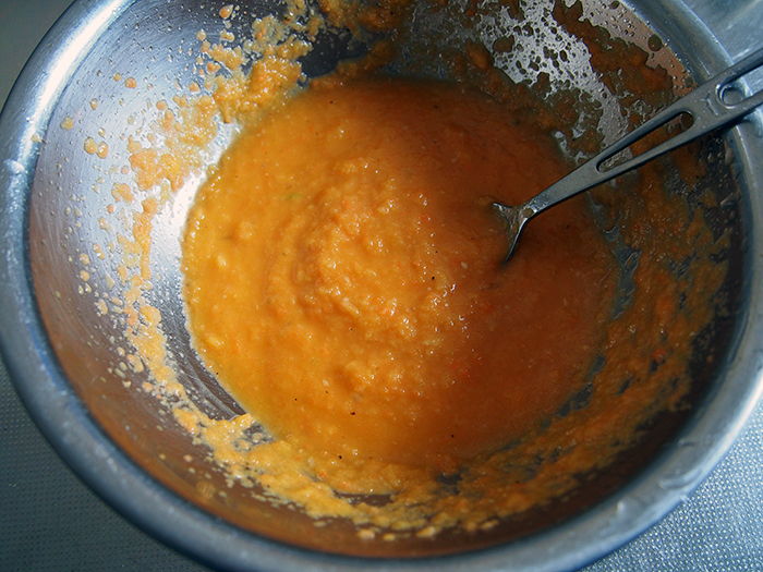 野菜ピューレに、サラダ油を少量ずつ入れつつ泡だて器で撹拌し、マヨネーズ状にする。