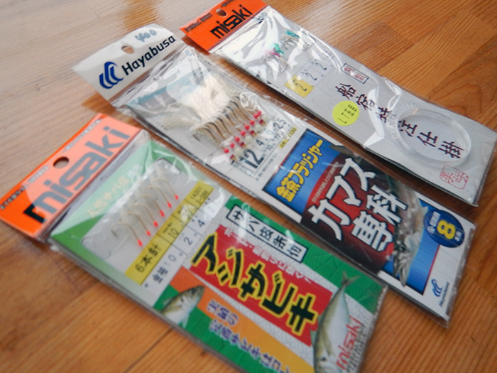 ▼ カマス釣りで使用した自製胴付き仕掛け(ハリに荷物用ビニールひもを巻いたもの)を、使用します。
