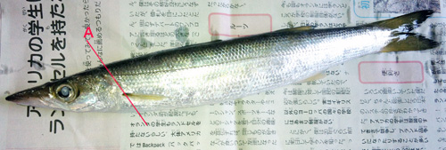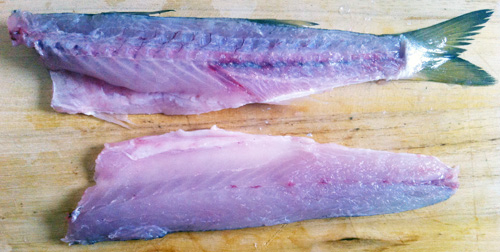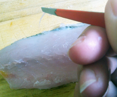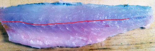 アジと同様、中央に入っている小骨(赤のライン)を毛抜きで抜く。