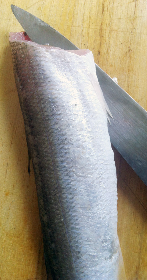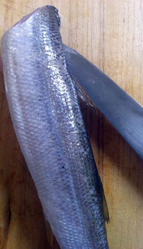 カマスは尾から頭のほうへ包丁で魚の表面をなぞるようにウロコを取る(家庭ではアラを出すまでは、新聞紙を敷いた上で行うとよい)。
