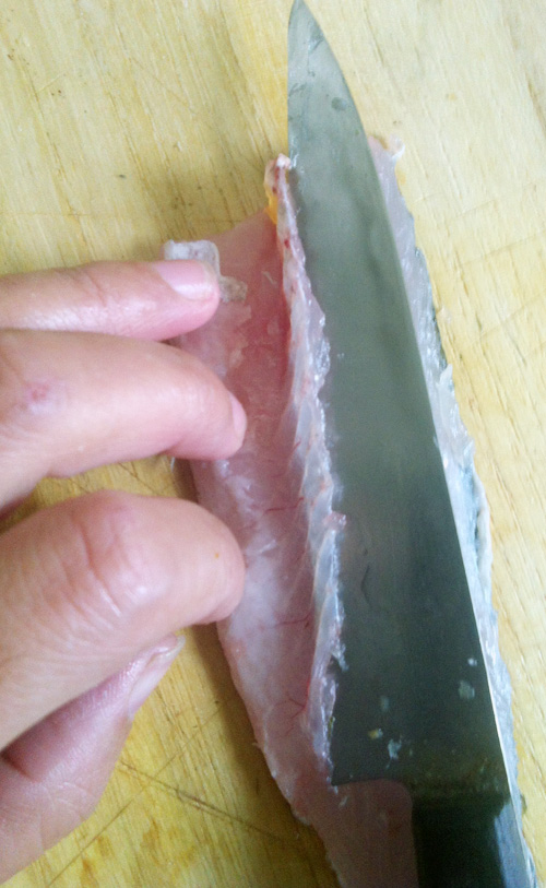両身の腹骨(人間でいうと肋骨にあたるところ)を、そぎ切る。