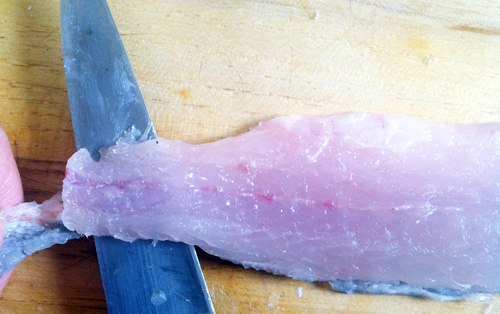 皮を下に包丁を寝かし入れ、皮をでしっかり掴みはいでいく。包丁は動かさず、掴んだ皮のほうを左右に振りながら剥がすようにすると、とうまくいきます。