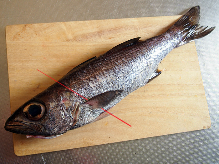 中骨まで到達したら、今度は背ビレに沿って、背側からも切り開く。