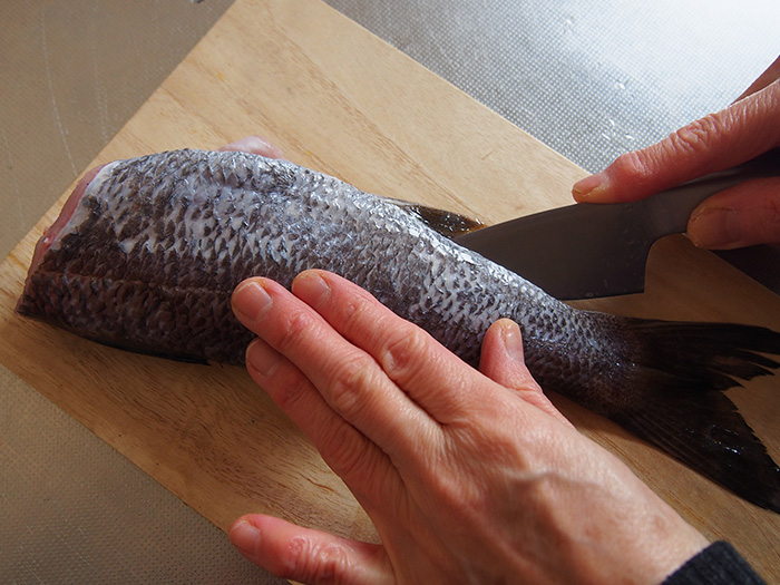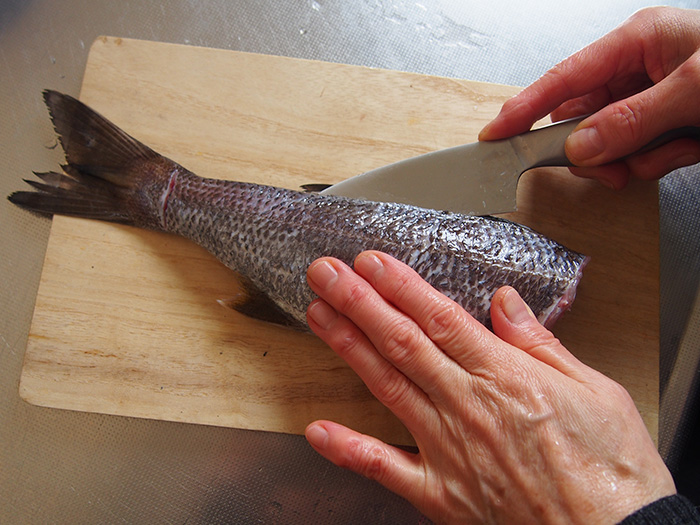 腹を開いて内臓をかき出し、流水で腹の中を洗う。