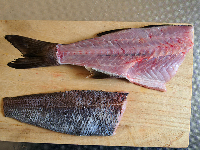 2枚(1枚は身のみ、1枚は中骨が付いた状態)に下ろした状態。
