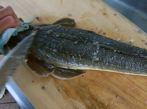 腹側からと、背側、両側から包丁を入れて、2枚におろす。中骨が硬いので、これはさほど難しくない。