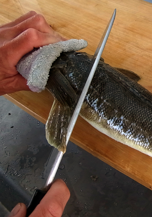 胸ビレの後から、頭に向かって斜めに包丁を入れる。反対側も同じ様にして、頭を落とす。