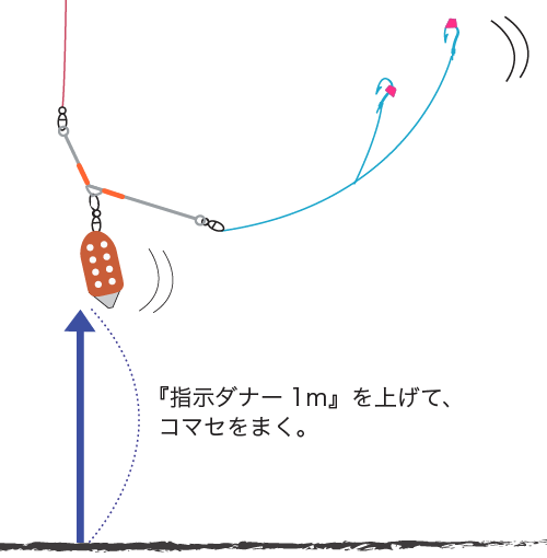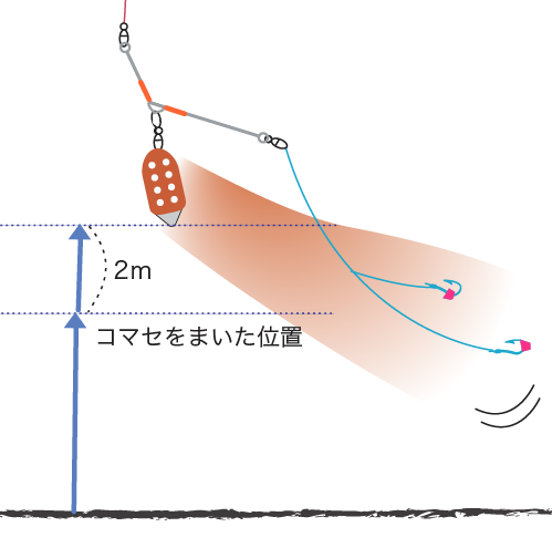 指示ダナから1メートル引いた分の道糸を巻き、コマセカゴを上下に振る。
