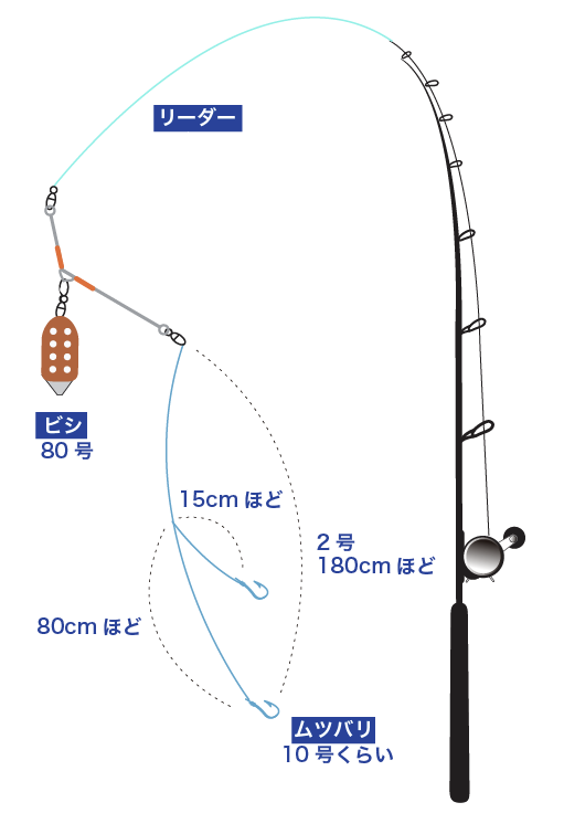 仕掛けに付いたビーズ玉などの光ものは取り、エサも海の中で光るアオイソメの使用を控えます。