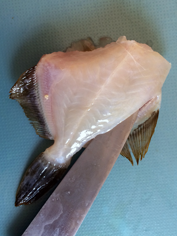 背ビレと尾ビレの上と下に、包丁で切り込みを入れてから、ヒレを引き抜く。
