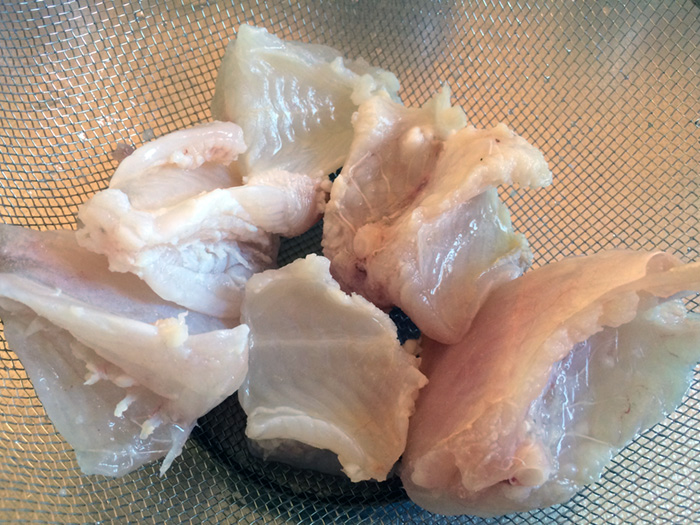 【2】に70〜80度のお湯をかけ、霜降りにする。