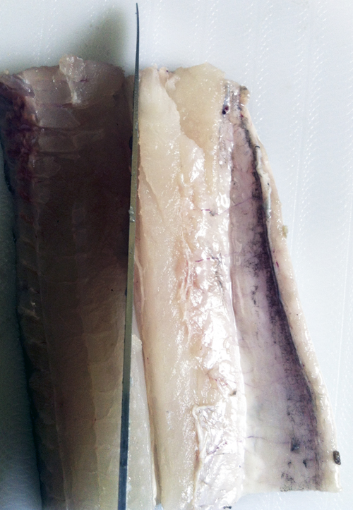 タチウオの身は縦に割れているので、それに沿って細造りにする。
