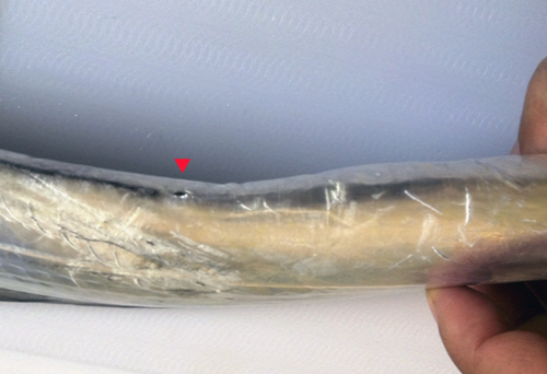 皮を破ると、赤黒い血合い肉(赤のラインの部分)が出てくるので、ここは流水と歯ブラシなどできれいに取り除く。