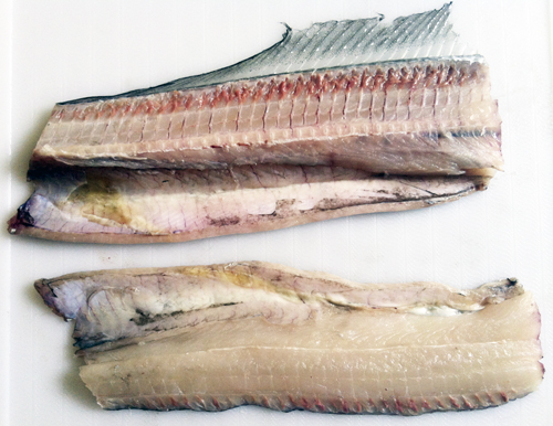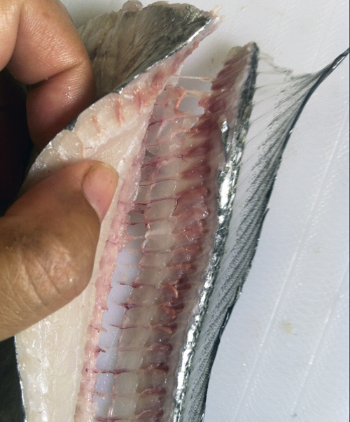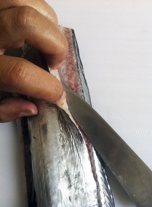背骨を下にして置き、2枚におろした時と同じ要領で、背ビレの間から包丁を入れる。