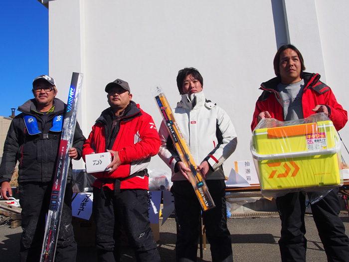 その後は各船宿の3,000円、4,000円、5,000円の乗船割引券、協賛いただいた品々が当たる抽選会へ。