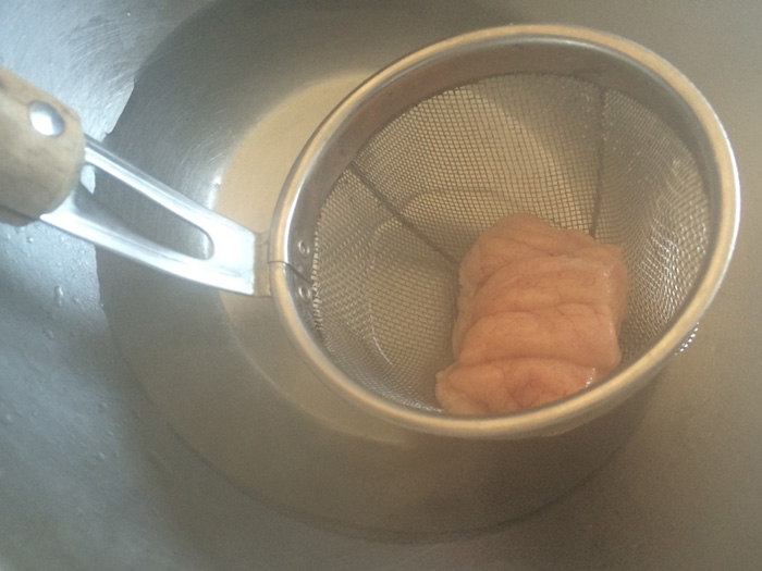 ホウボウの身を60〜70度くらいのお湯にくぐらせ、表面を霜降りにする。