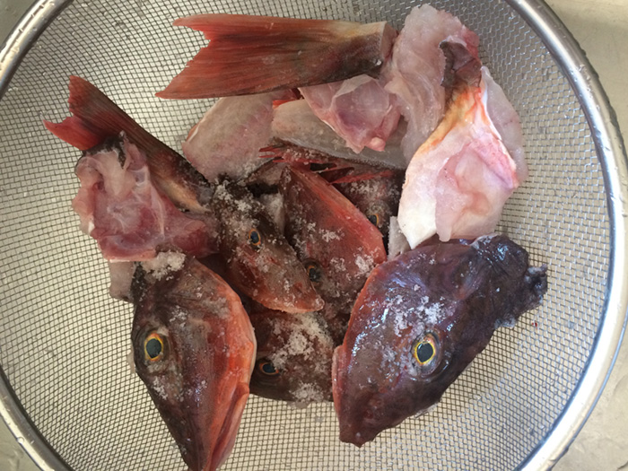 鍋に水と少量の酒、一片の昆布とアラを入れて火にかけ、10〜15分ていど煮る。