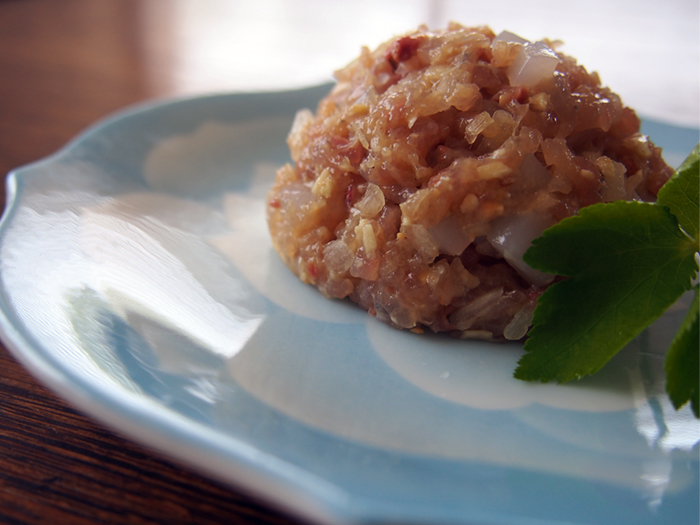 こってりとするまで叩いたアジに、イカのコリコリとした食感を合わせました。 【材料 … 続きを読む 混ぜ込んだイカの食感が楽しい、アジのイカ入りなめろう