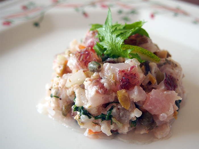 ■ 食材 マダイなど白身魚 タマネギ:適量 ケイパー:適量 オリーブ:適量 オレ … 続きを読む マダイのタルタルサラダ