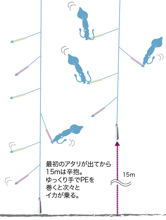 【2】の誘いを2〜3回くり返しても、イカが乗らない時は、20〜30メートル仕掛けを巻き上げ、落とし直す
