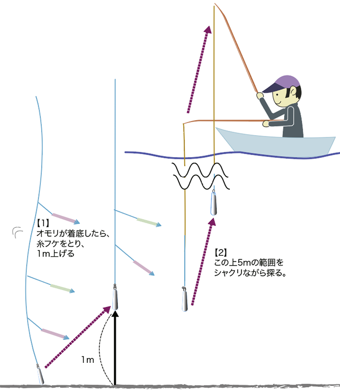 【2】で誘っても乗ってこない時は、30メートルほど巻き上げてから、もう1回落としなおしてみましょう(いわゆる、巻き落し)。