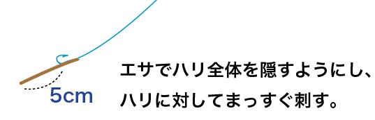 ハリが完全に隠れるようにまっすぐ付け、ハリ先はエサから出して下さいね。