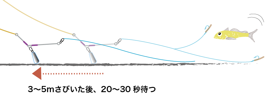 仕掛けをキャストし、オモリが着底したら、仕掛けを馴染ませた後、底をズルズルと這うようにサビいてきます。
