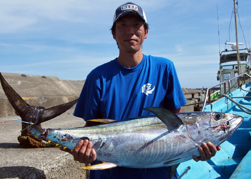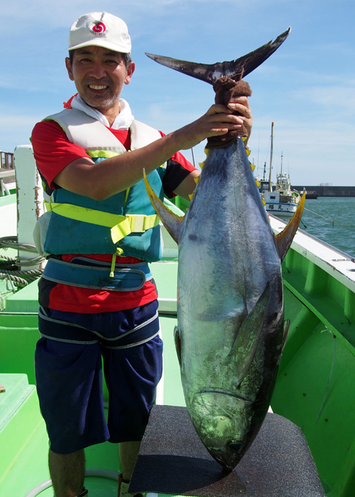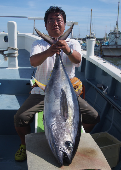 ↑ 潮田敏明さん、貸し竿で初のキハダ、20キロをキャッチ!