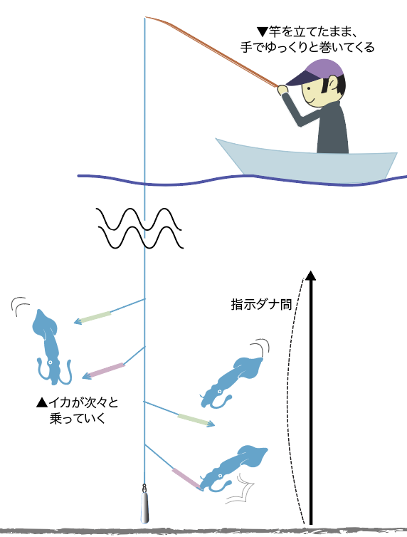イカの遊泳層に、スピードの遅いツノが入ると、次々とイカが追い乗りしてくるでしょう。
