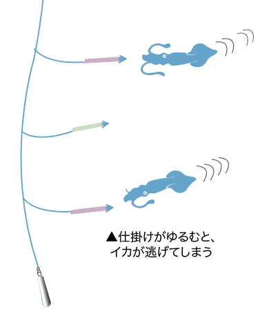 それでも乱暴に竿を上下させると、仕掛けがゆるみ、返しのないハリからイカが逃げてしまいますので、気を付けてください。