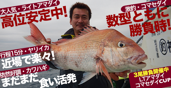 明日は全船、満船となりました。 コマセマダイ船の最後のメールご予約は、10時2分 … 続きを読む 【12月29日】大アマダイ55センチ、大カワハギ30センチをキャッチ!『コマセマダイCUP』とうとう首位変動!