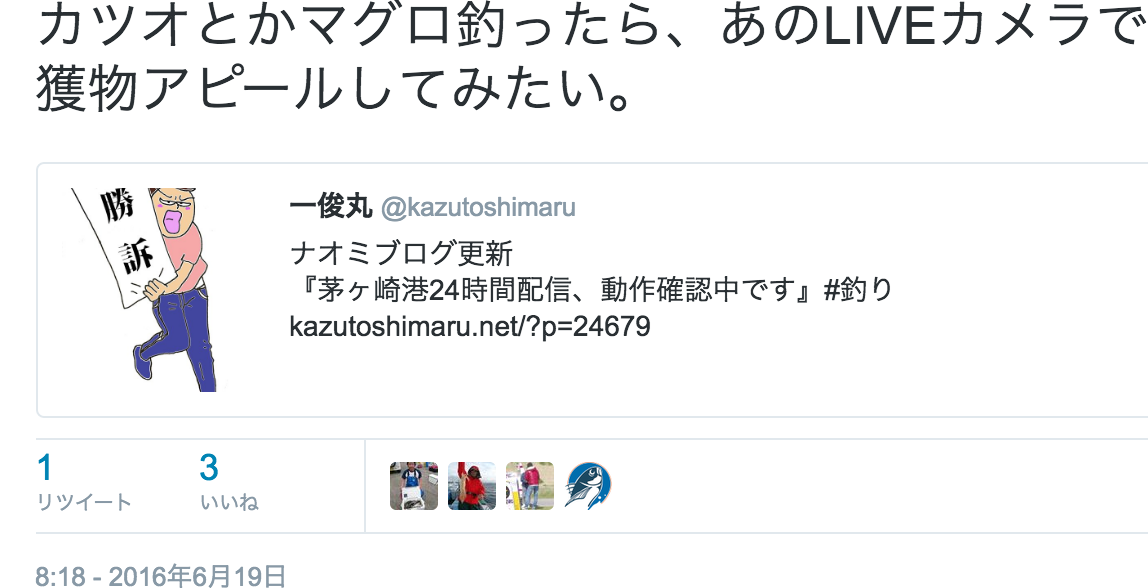 ▶現在のサービス ▶船・スタッフ紹介 ▶殿堂入り釣果 ▶一俊丸チャンネル ▶お料理レシピ ▶秘伝テクニック C.S.C.NAOMIEブログ > Work > 24時間配信パワーアップしました! 24時間配信パワーアップしました! 2016年6月26日 c.s.c.naomie 試行錯誤をくりかえし、とうとう完璧に配信できるようになりました! 24時間茅ヶ崎港ライブ。 しかも以前より、画像はクリア。 大幅なパワーアップです! 茅ヶ崎港の現在の様子24時間配信中 さて、今回の配信リ・スタートも、みなさんに歓迎されて、嬉しい限り。 波の情報もわかっていい、とサーファーからもツィートいただきました。 中でも気を引いたのは、これ。 カエル君にちらっとこのことを話すと、すかさず…… さすが、エンジニア。 質問はクレーム、お願い、提案はすべて『挑戦』と受け取る。 これまた夏が楽しみだ! 関連記事: 天使は包丁を持って舞い降りる すっかり全裸泥酔キャラ 釣り師の本音。 常連さんたちの一俊丸を思う気持ちにジーンときた 当たり前のことを当たり前に見せる、ということ 春の健診エントリー