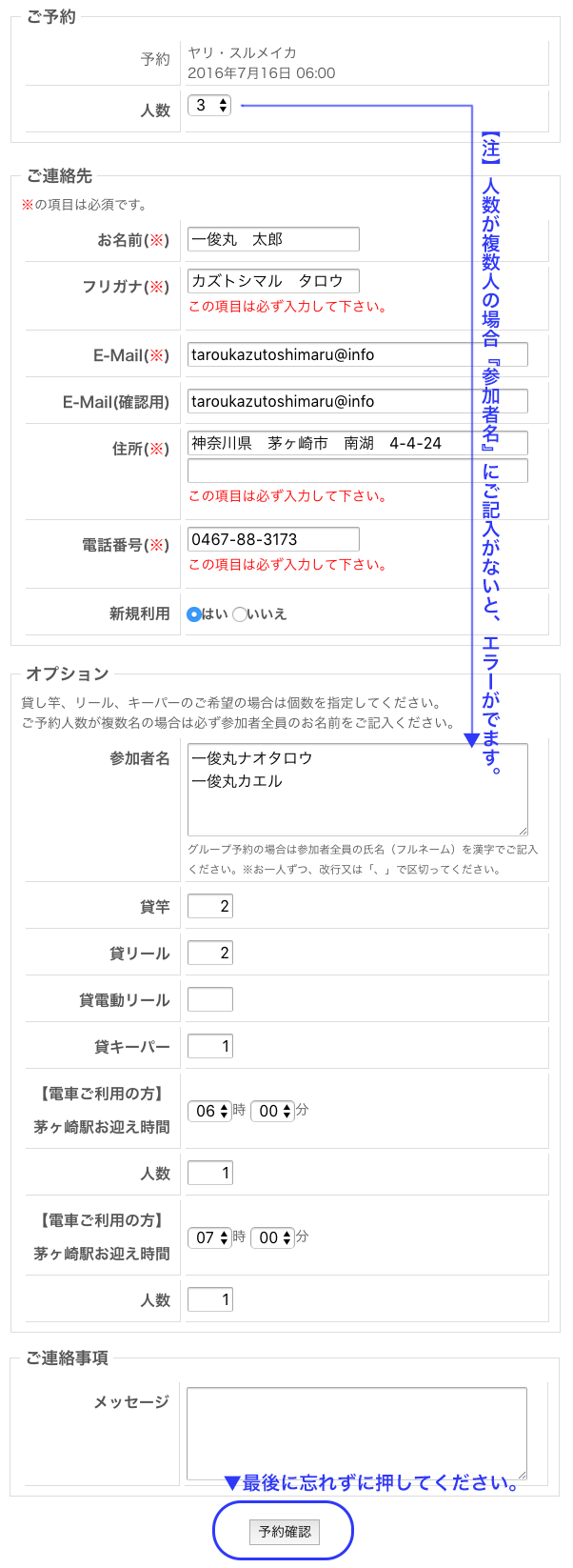 【3】ご予約の詳細と、貸し竿などオプションの選択
