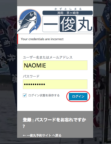 【5】予約サイトに戻り、ログイン名と、仮パスワードを入力して、ログインします。