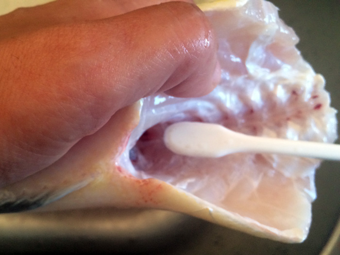 歯ブラシなどで、血合い肉をきれいに掃除し、流水で流す。
