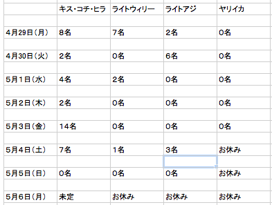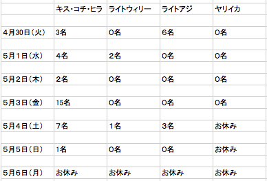 ■ 今後の出船予定 5月1日より、オープン時間が5時に、8日より4時半に変わりま … 続きを読む 【追記あり】GWのご予約状況を表にしました
