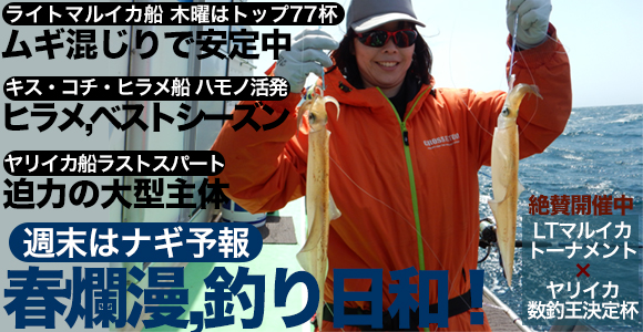 ゴールデンウィーク中のライトマルイカ船は、座席に余裕をもたせるため、2隻出しの日 … 続きを読む 【4月26日】ライトマルイカは、今こそ入門最適時。深場で型よく、ムギ混じりで釣果安定中!